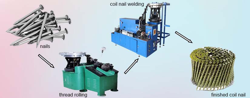 wire rod ----- Nail making and polishing ----- nail threading ----- coil nail welding ----- finished coil nails