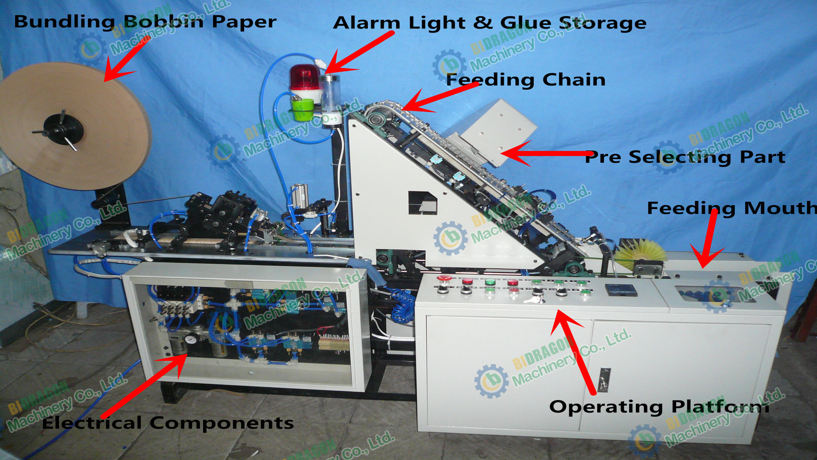 The bander is mainly made up of several parts: Paper Feeder, feeding device, queuing device, banding device, surface sizing device. Powered by the distribution box, the tongue depressor is delivered to the queuing device, and queued by the cooperation of discharge wheel and chains, then banded by the reciprocating motion of the two cylinders, after surface sized, the banding process is done.